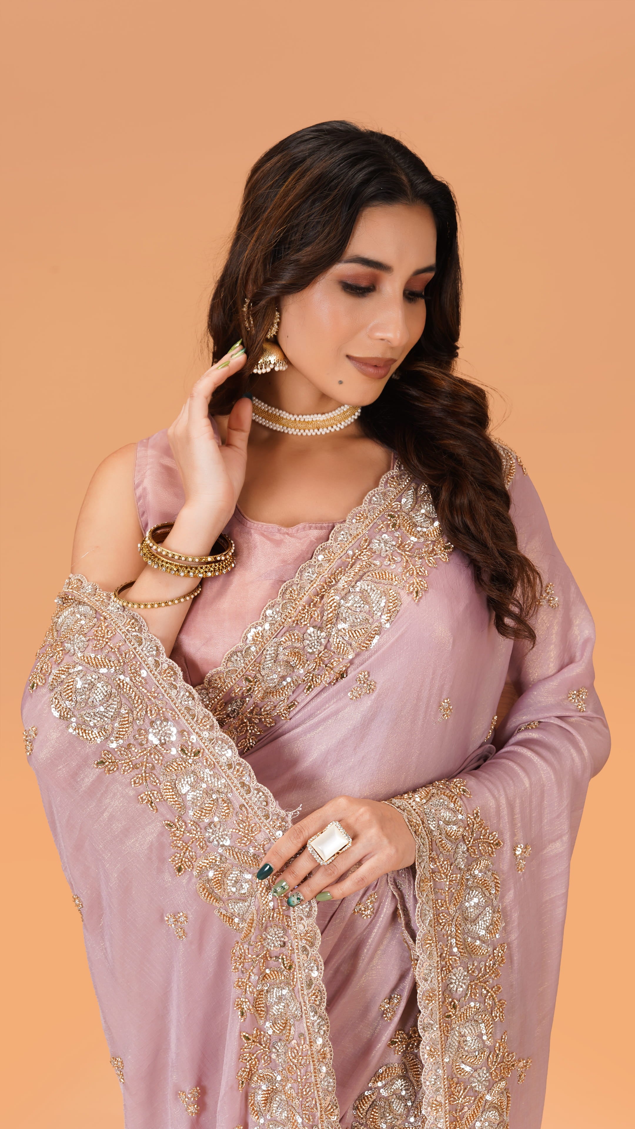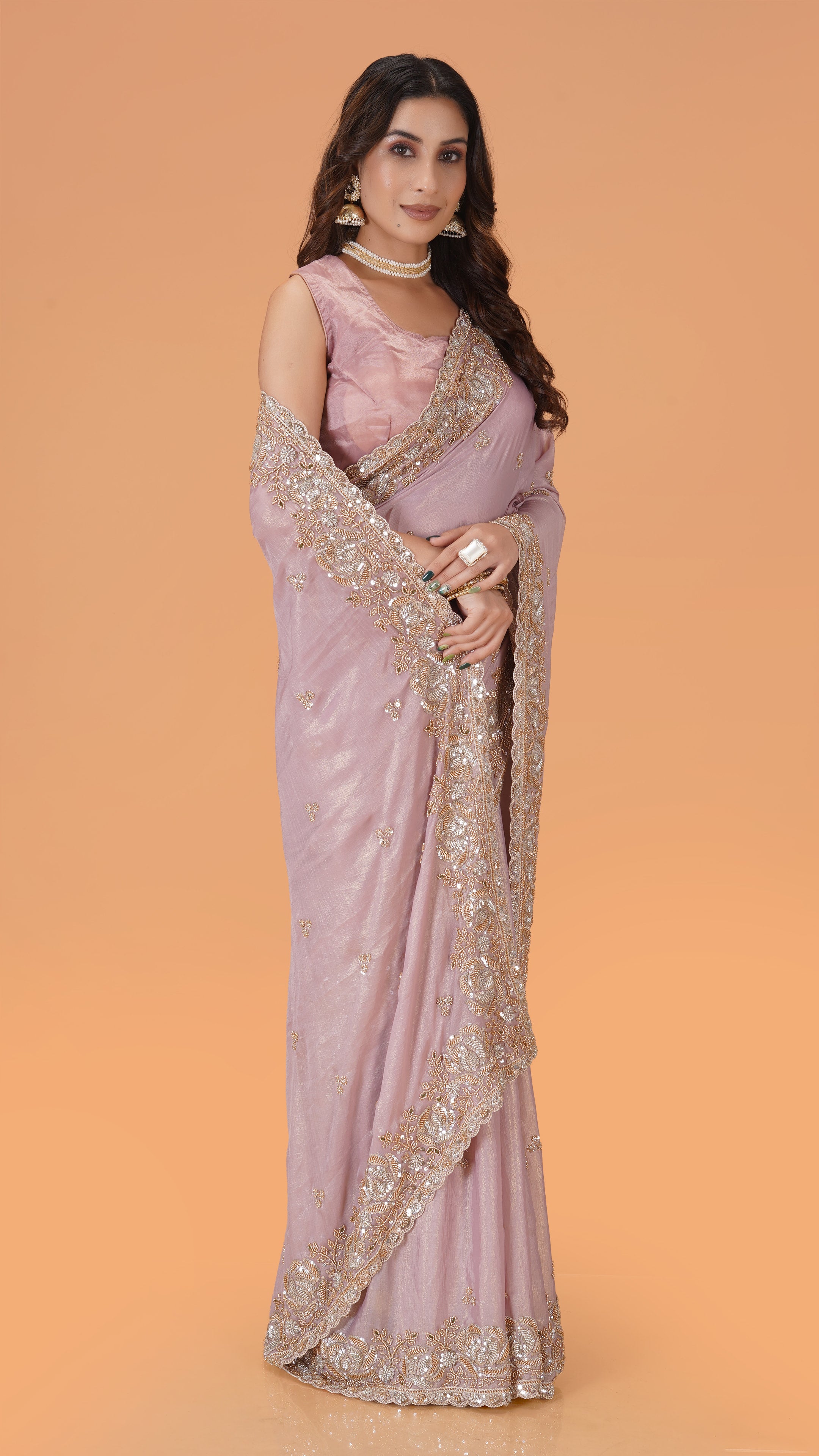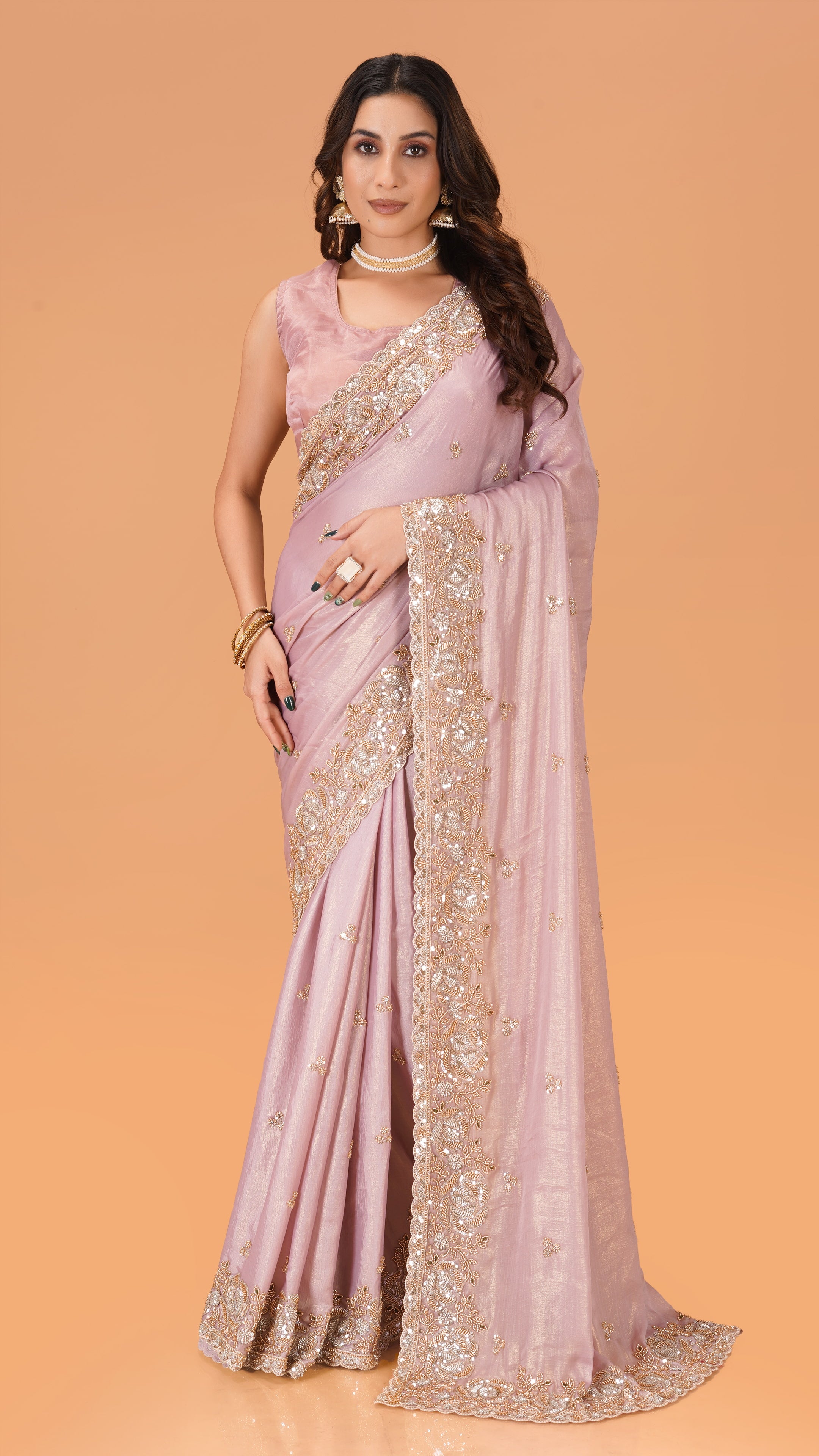 This pink chiffon saree is designed with shimmering foil, golden bead accents, and sparkling sequins, adding a touch of glamour to any occasion. Its beautiful color and luxurious fabric make it perfect for weddings, events, and other special occasions. Elevate your look with this stunning saree.