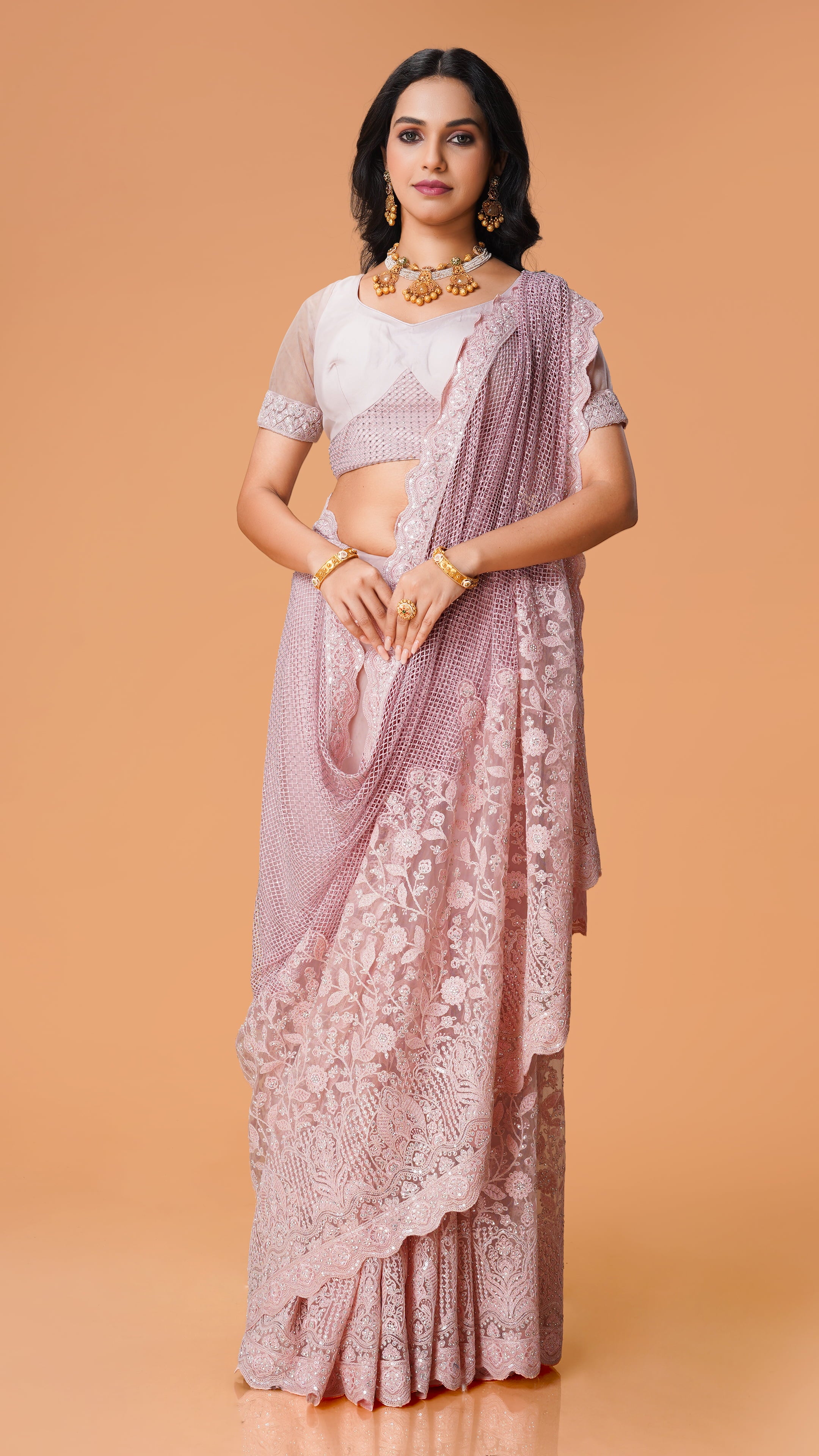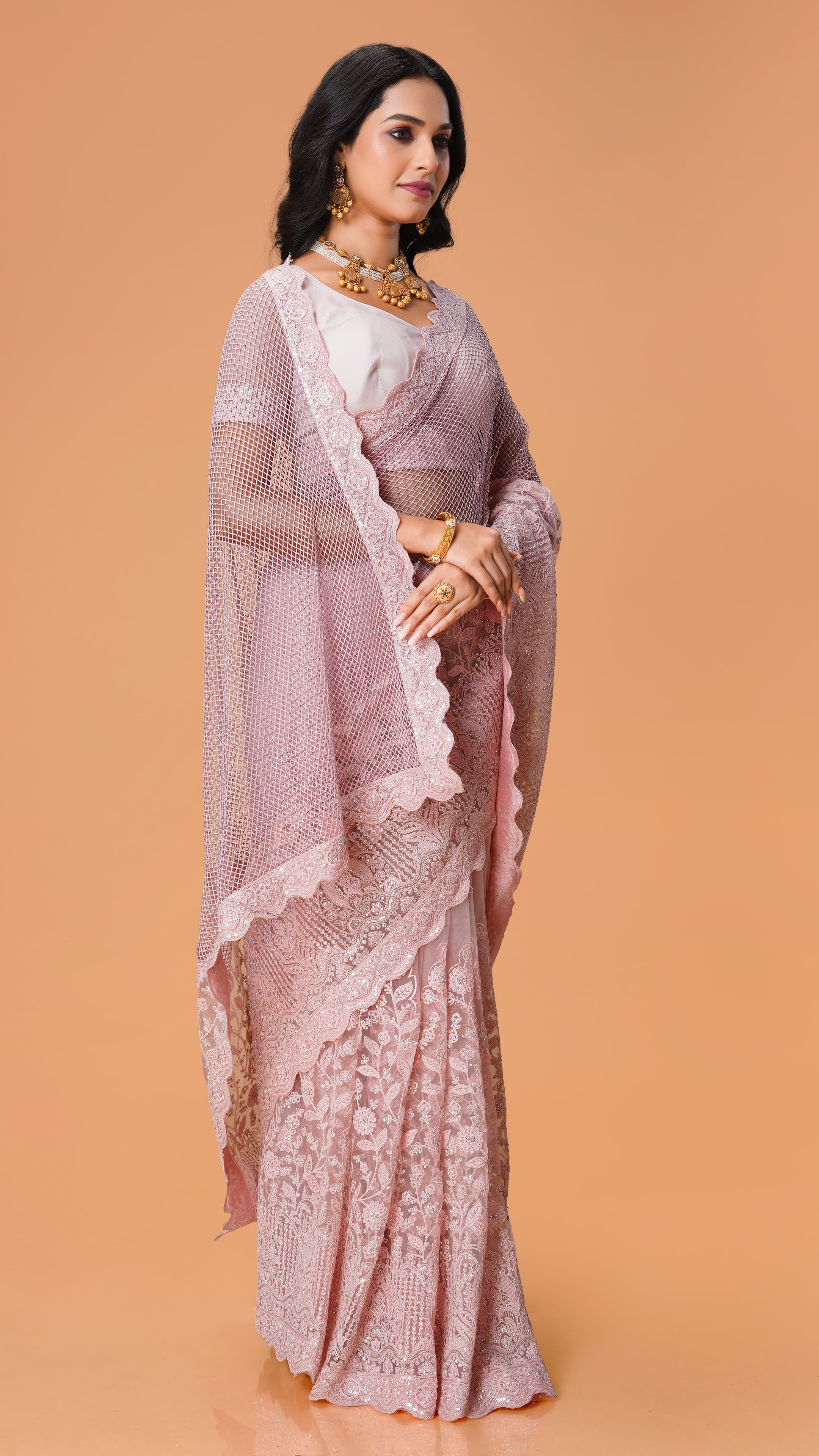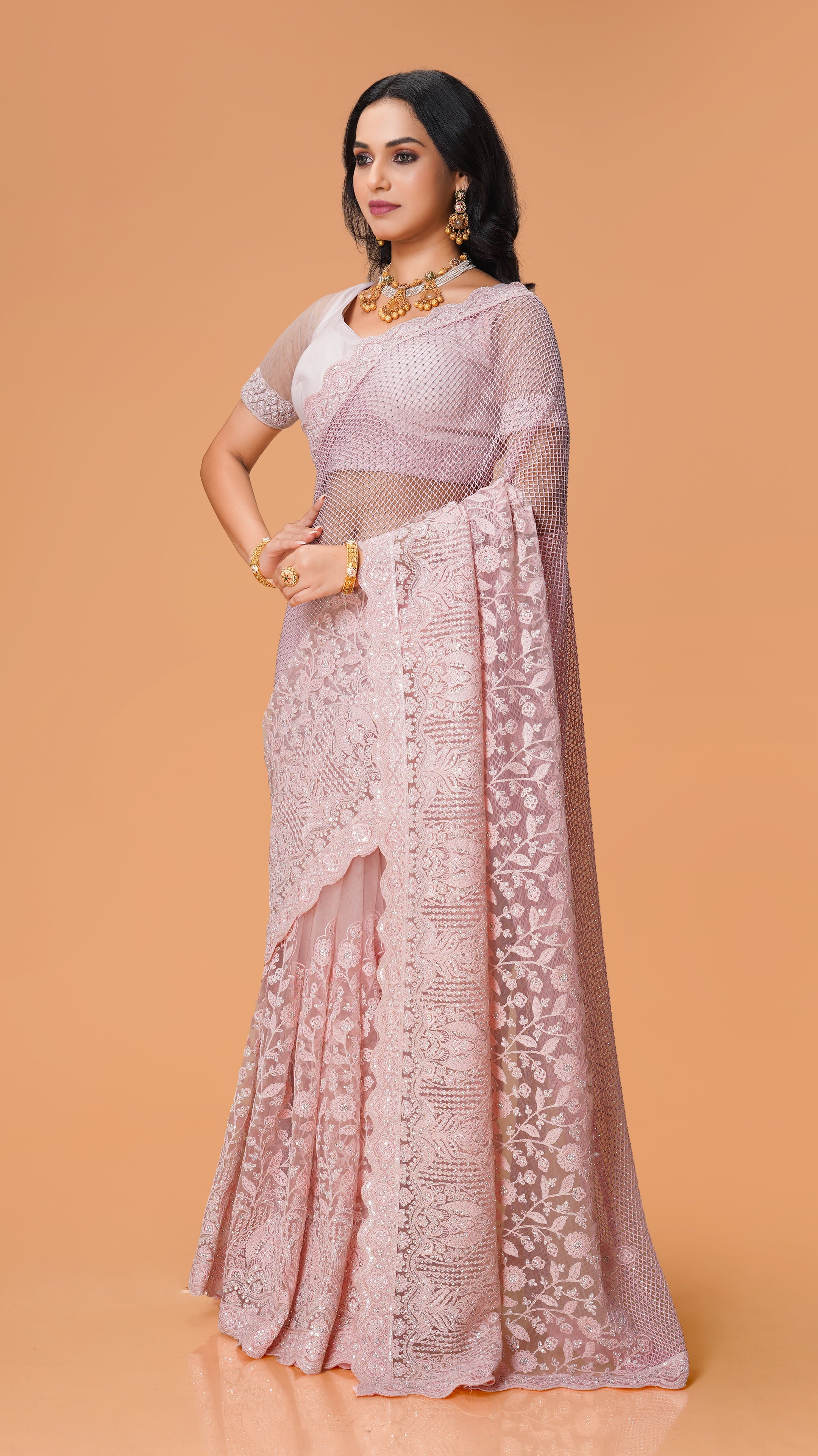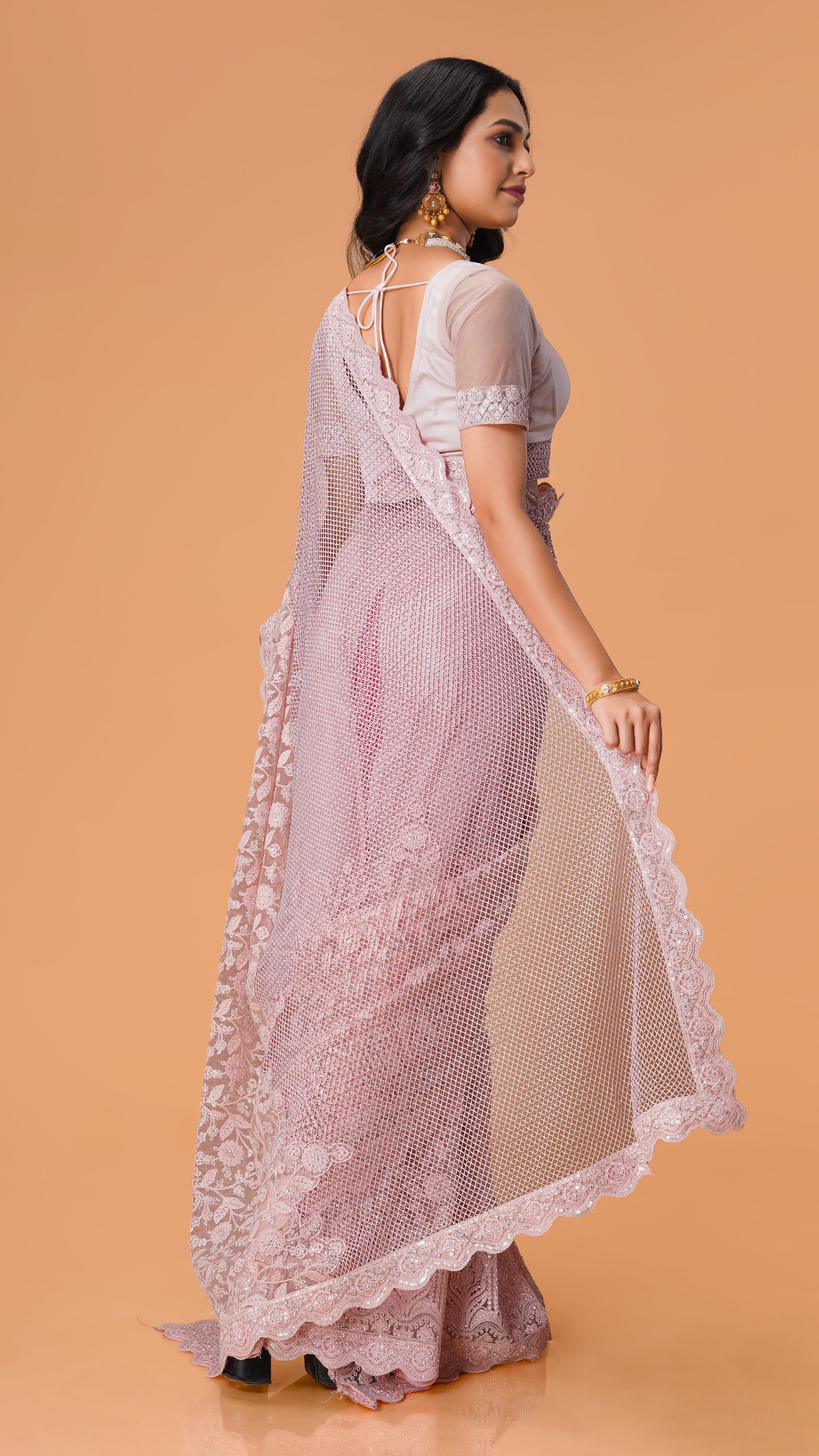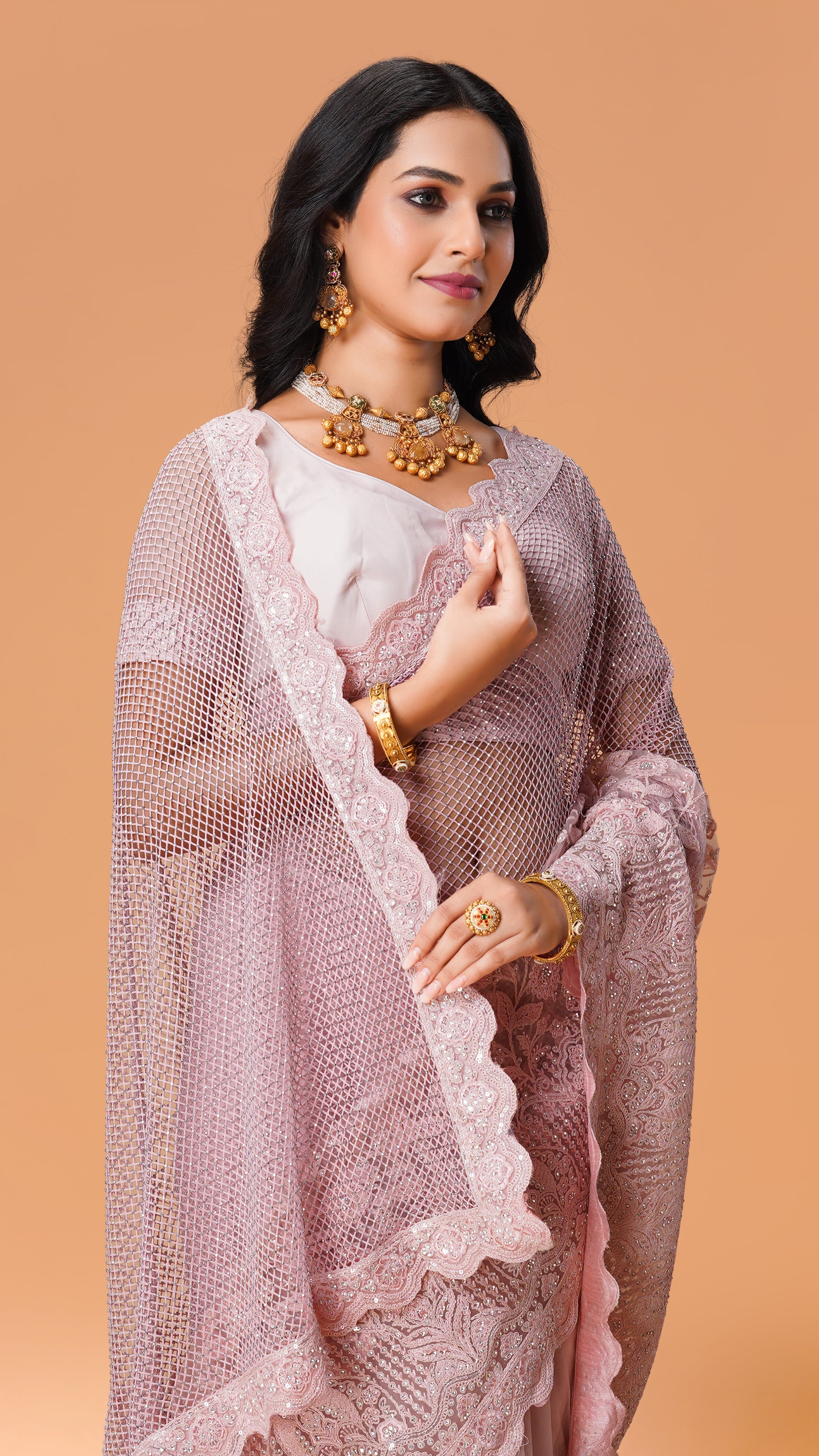 Enhance your elegance with our Baby Pink Stone Work Net Saree. Featuring imported fabric and a unique half and half concept, this saree will make you stand out in any occasion. With intricate stone work, it's the perfect choice for a touch of glamour and sophistication.
