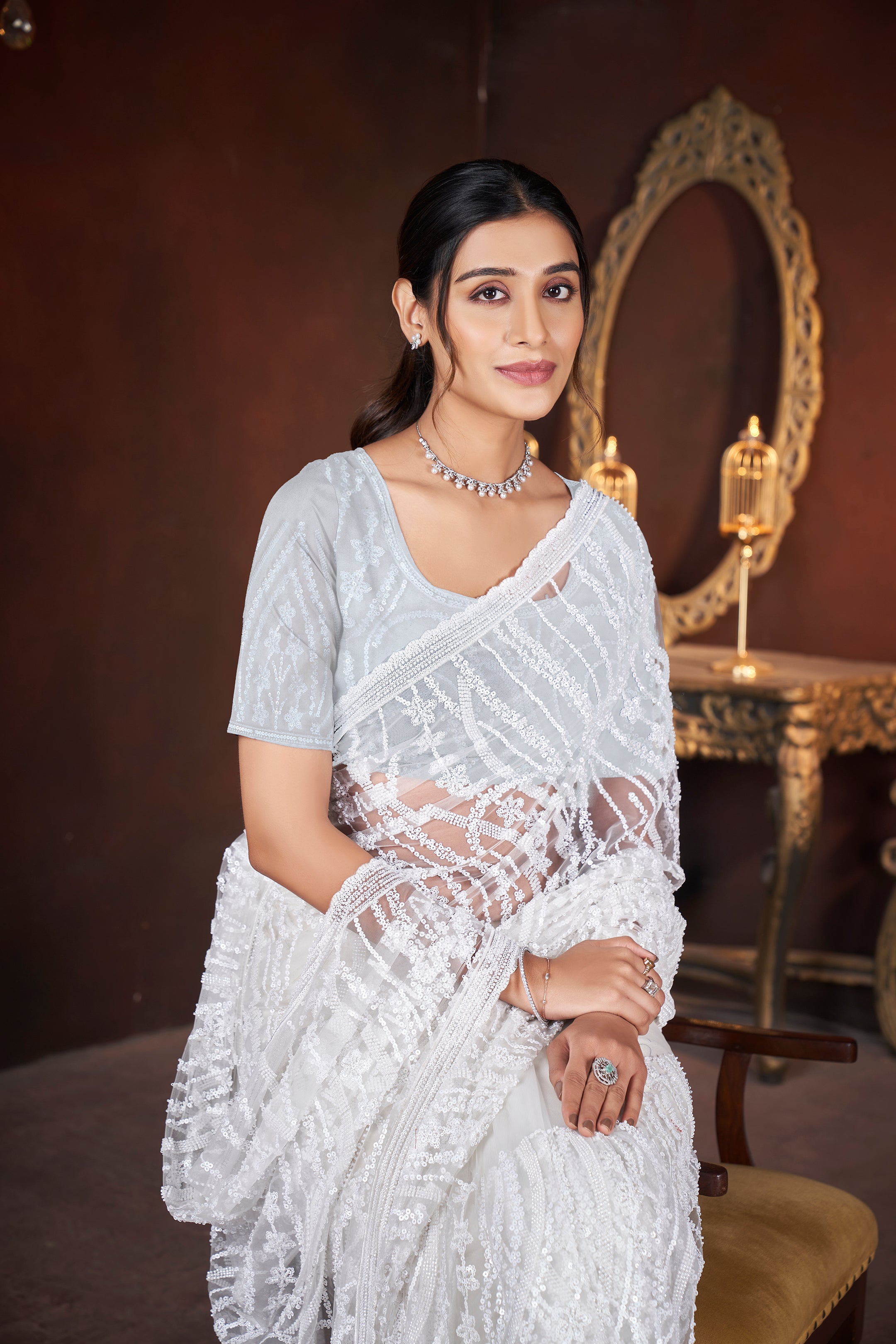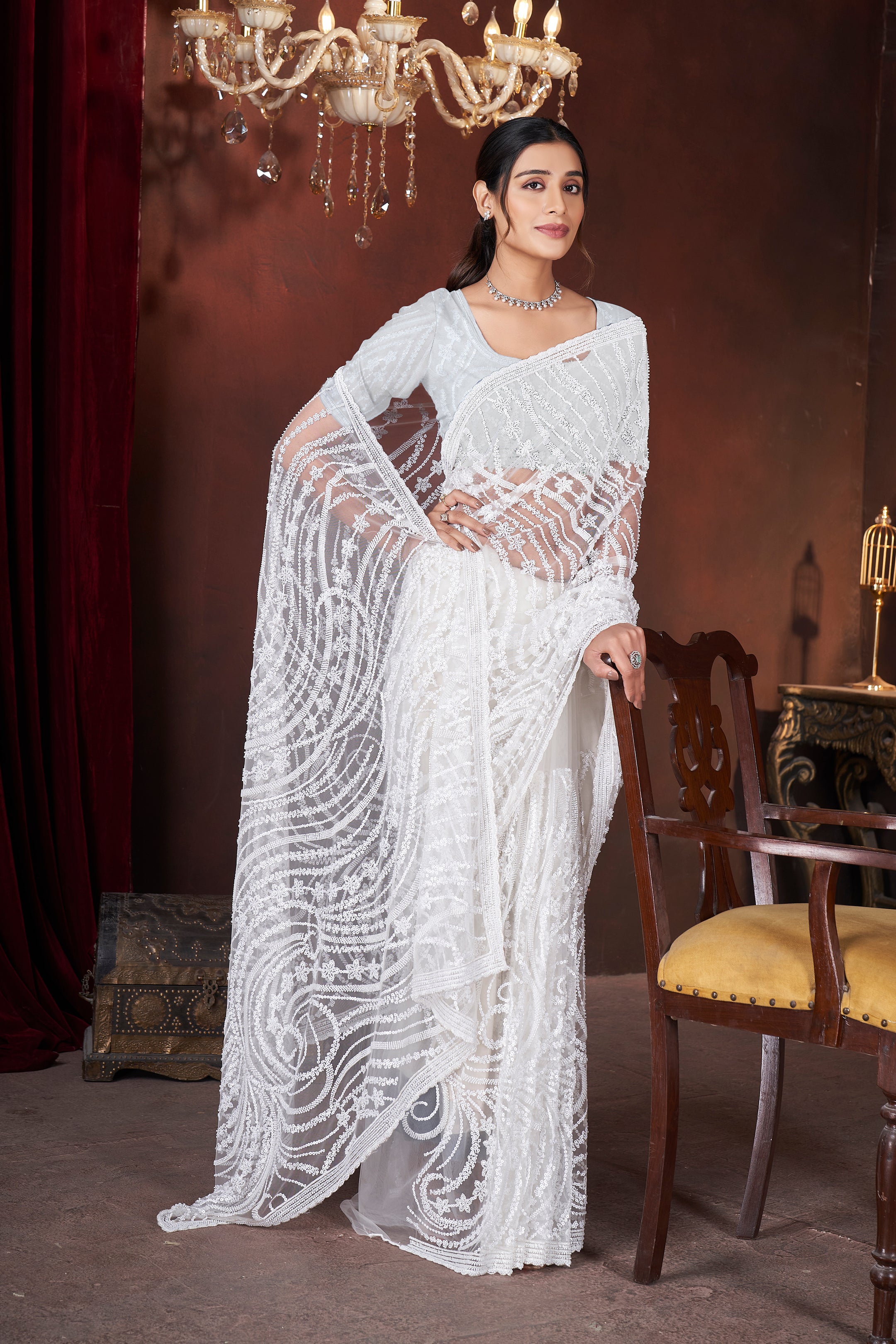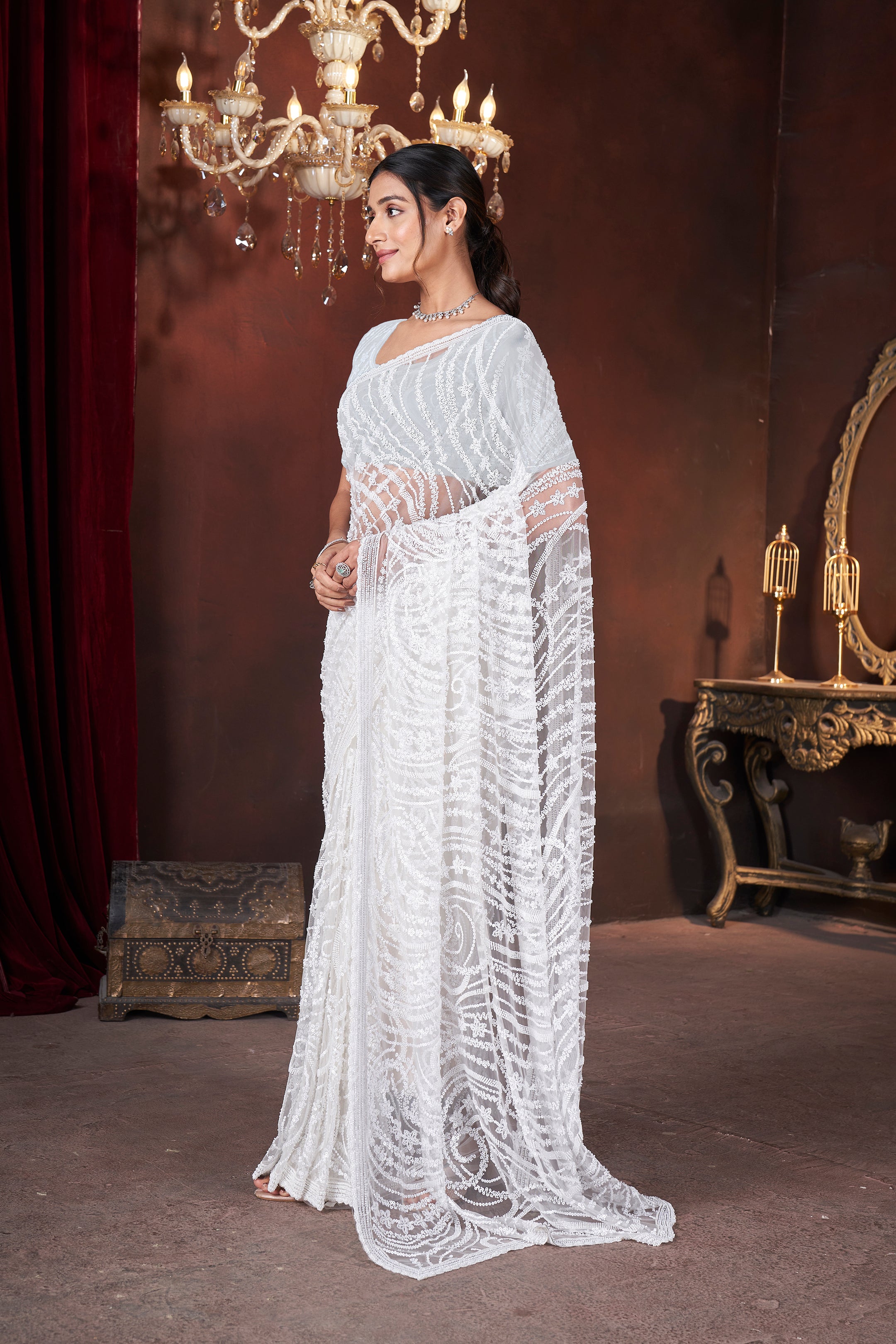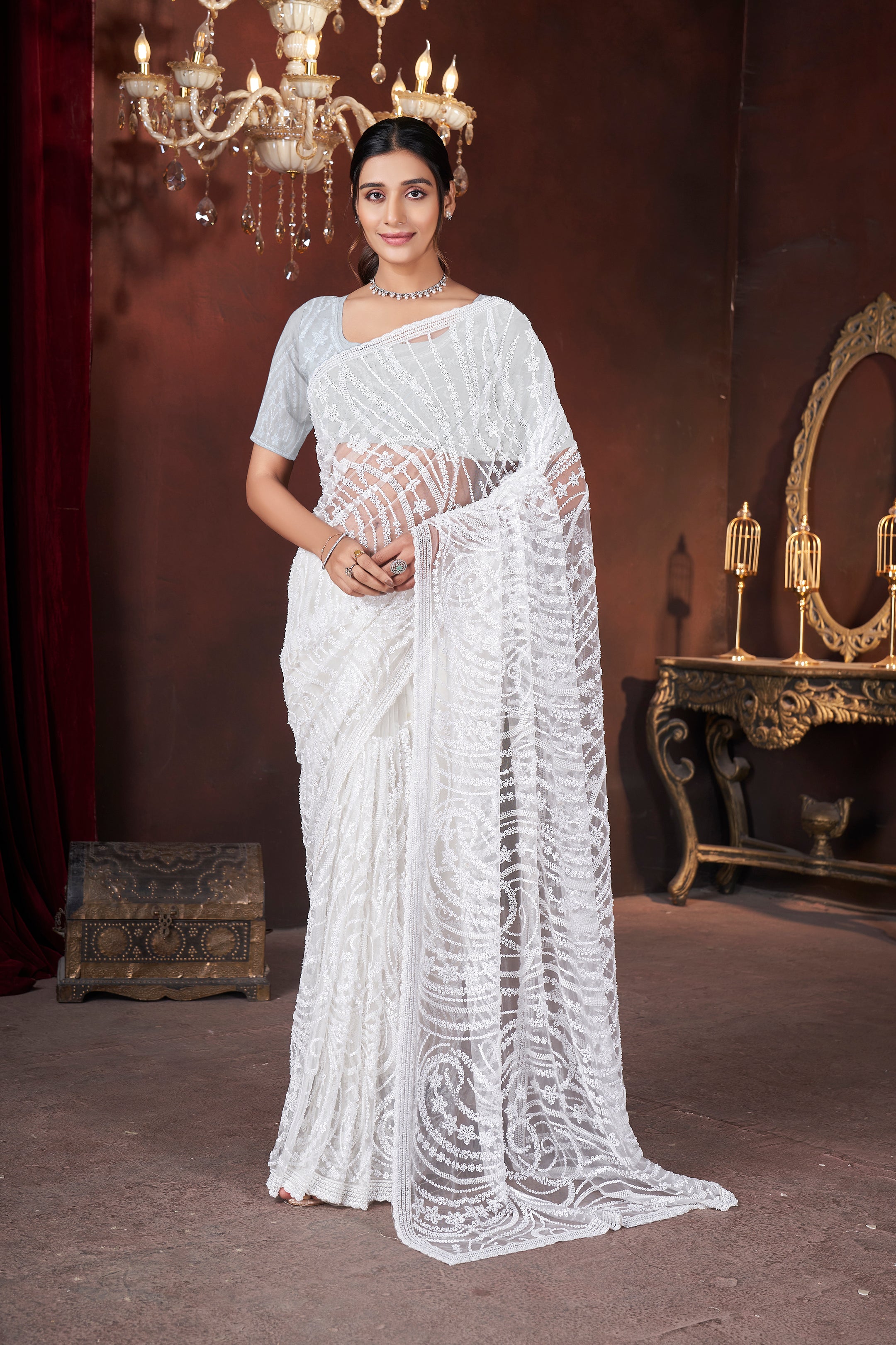 Ivory Illusion – Exquisite Embroidered Net Saree