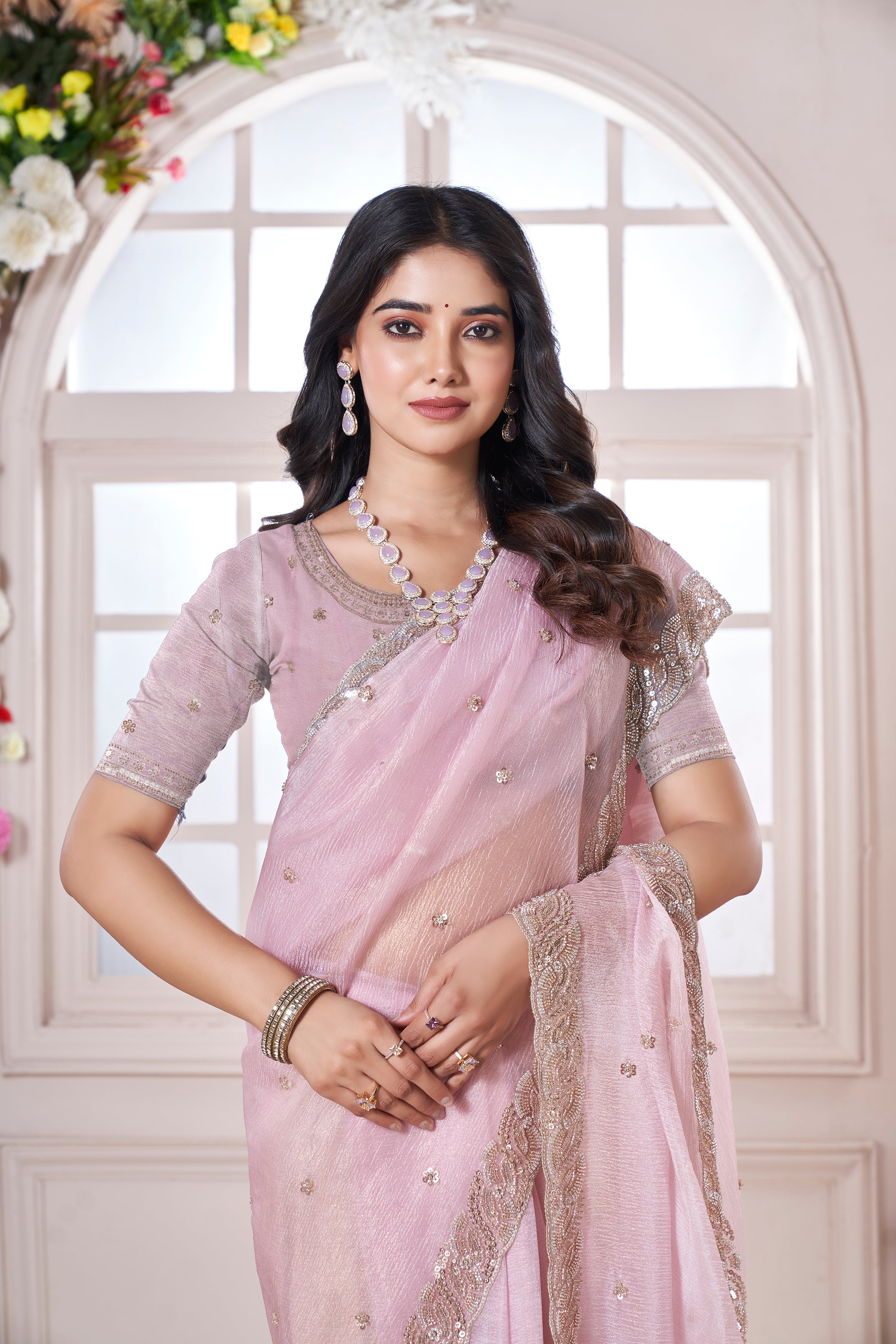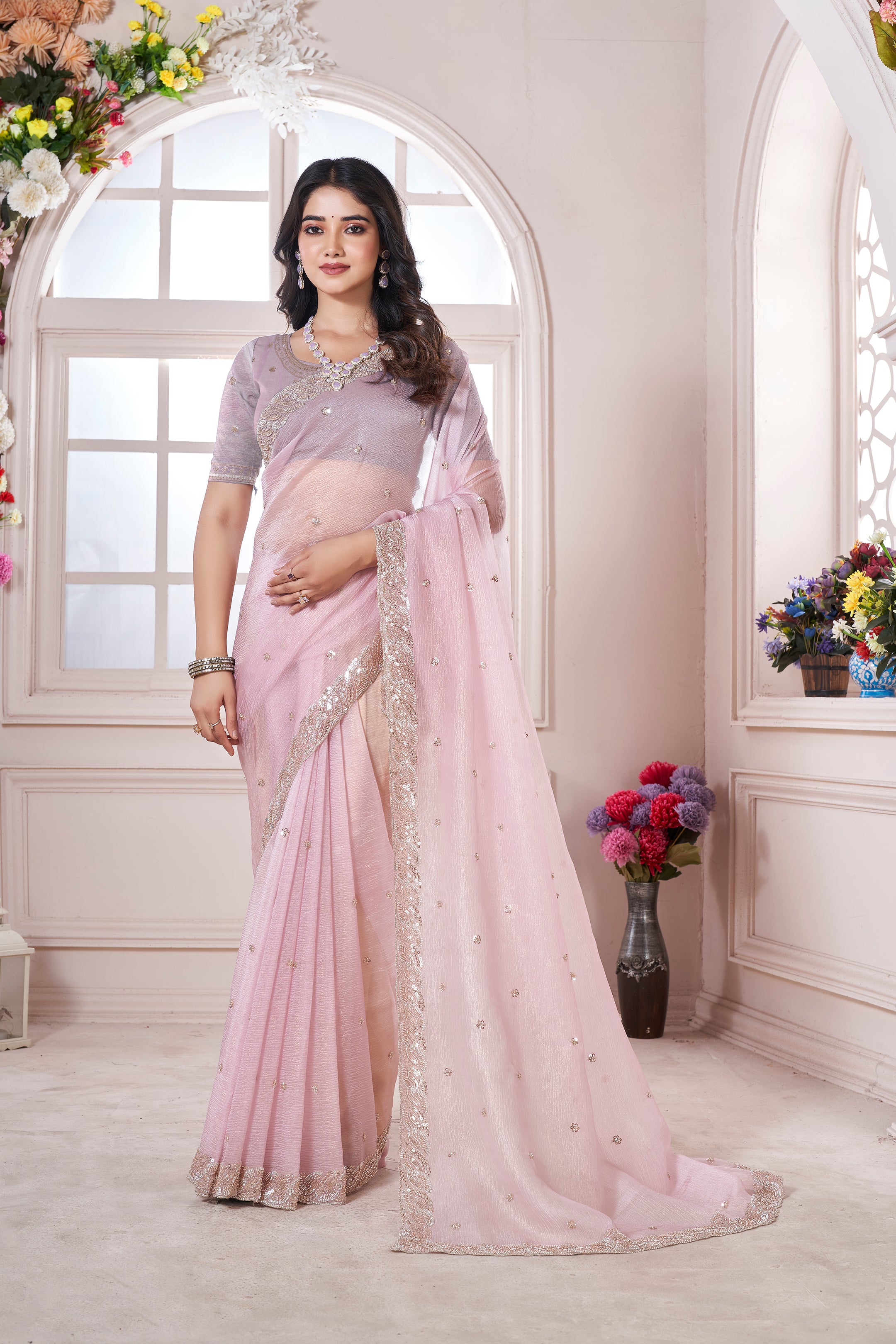 Add a touch of romance to your wardrobe with our Lavender Crushed Georgette Saree. The soft pink fabric is adorned with golden beads and sequins, creating a shimmering effect that catches the light. The stunning golden border adds to its timeless elegance, making it a perfect choice for weddings, festive occasions, and evening wear.