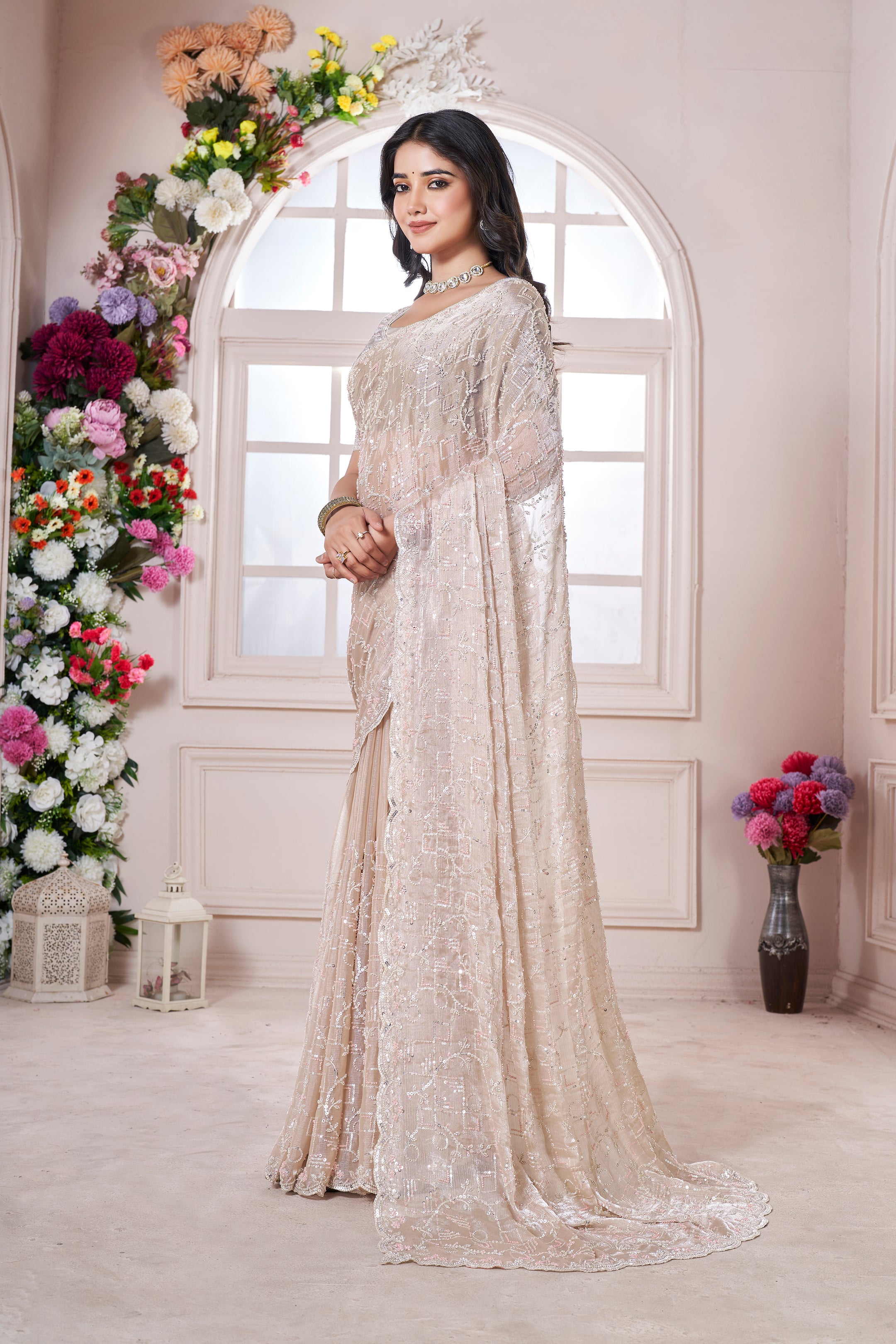 Indulge in sheer elegance with our Golden Zari Chiffon Saree! The lightweight fabric drapes beautifully, while the intricate Beads & Sequin work adds a radiant shimmer. Be the star of any occasion with this enchanting saree, perfect for weddings, festivals, and soirées. Make heads turn with every step!