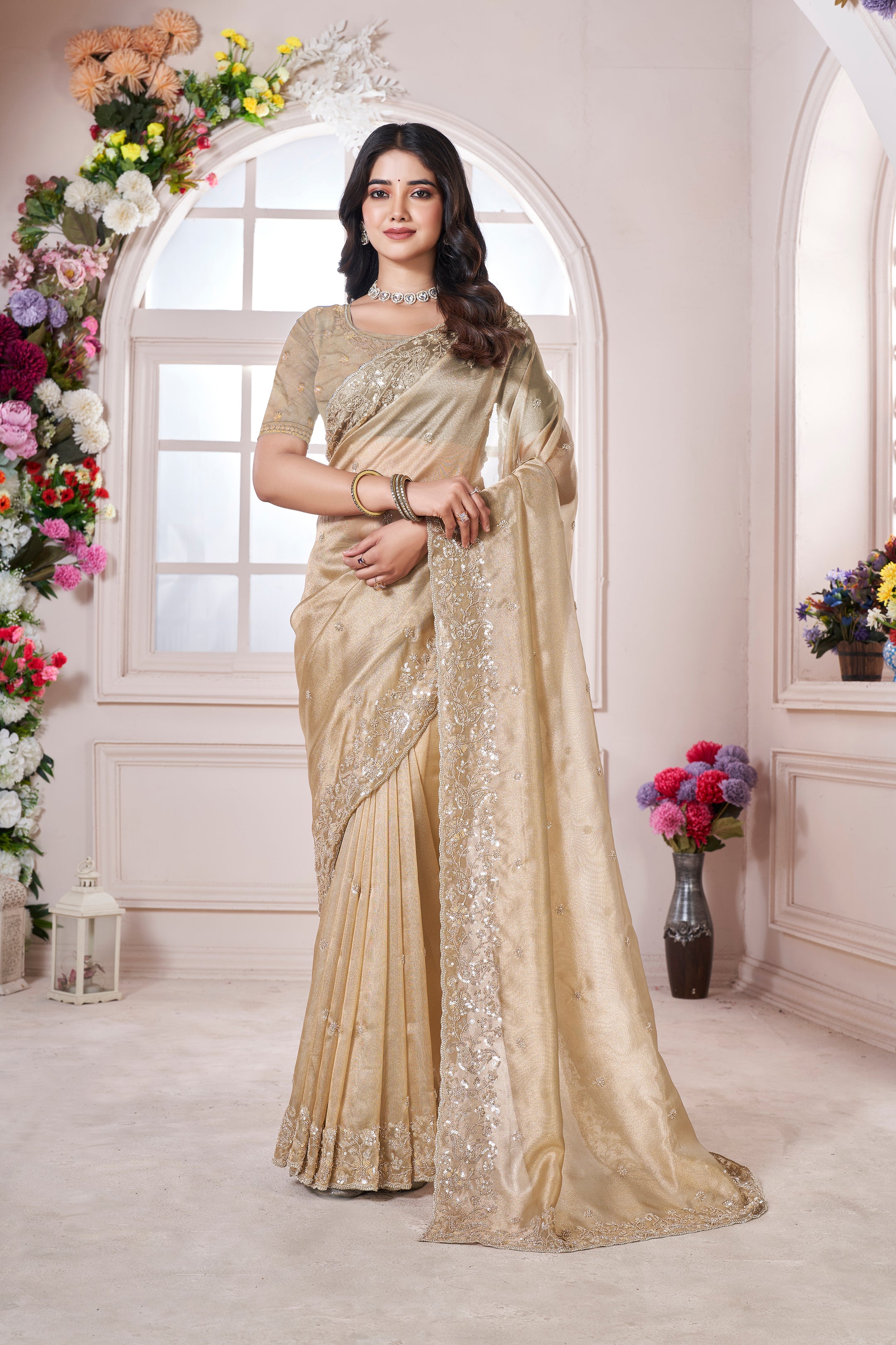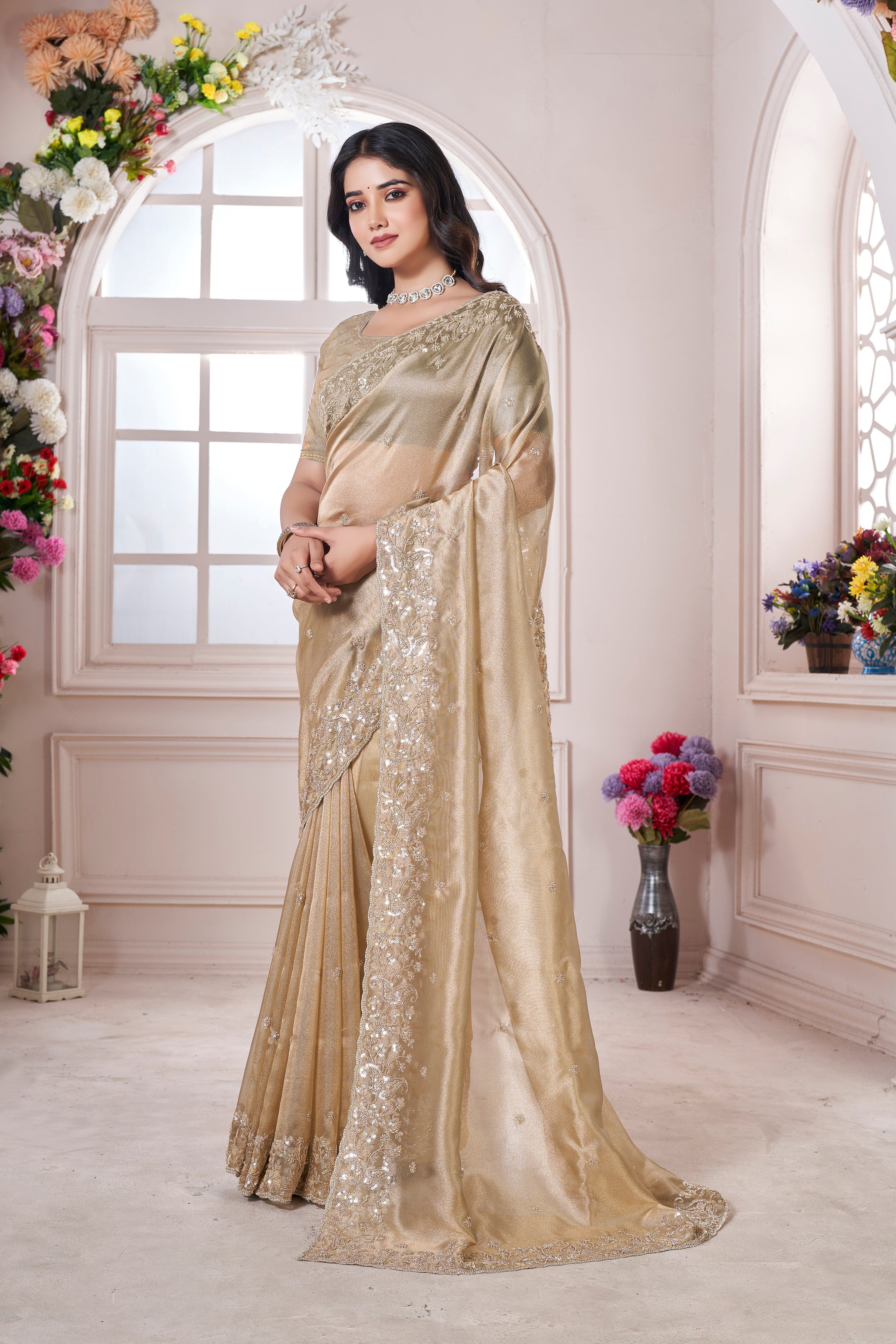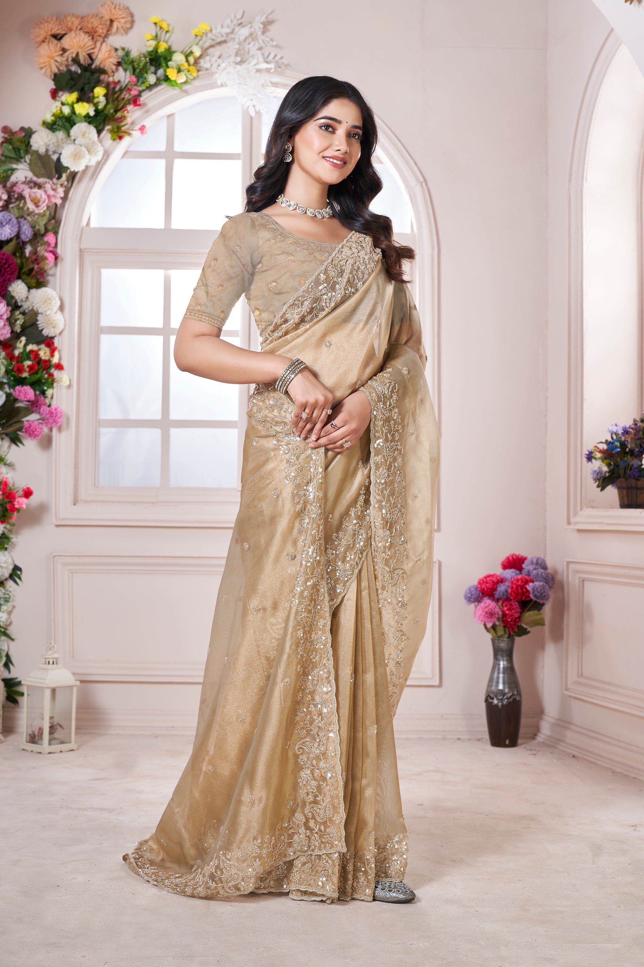 This luxurious silk-blend organza tisssue saree is a perfect choice for weddings and celebrations. The intricate zari embroidery and shimmering sequins And Beads add a touch of opulence and grace to the premium golden fabric. With a lightweight drape and delicate craftsmanship, this saree is designed to be the perfect choice for grand occasions. Complete with a matching embroidered blouse, it guarantees to make you stand out with timeless elegance. Whether you're the bride, bridesmaid, or a guest, this masterpiece is sure to captivate all eyes.