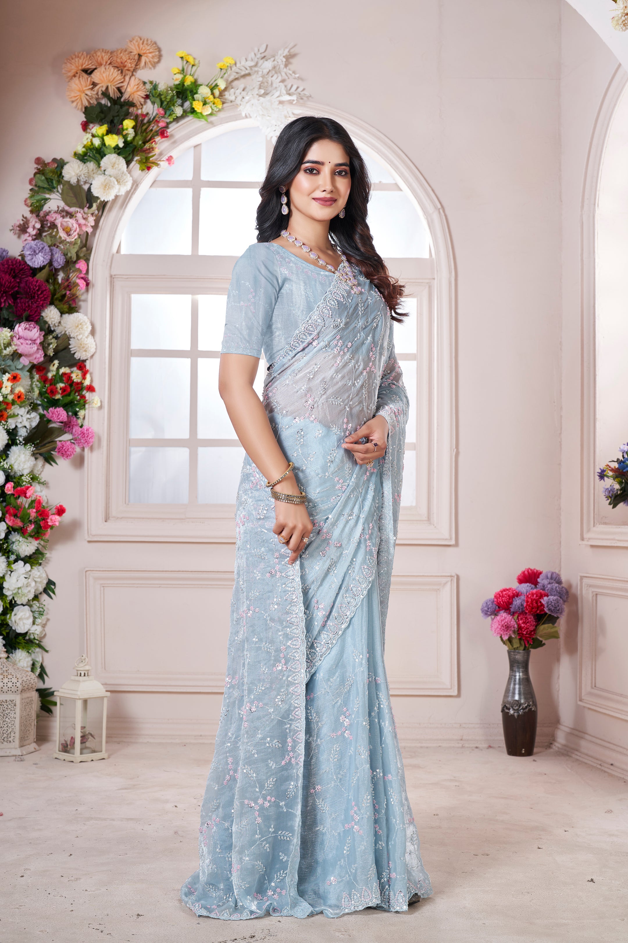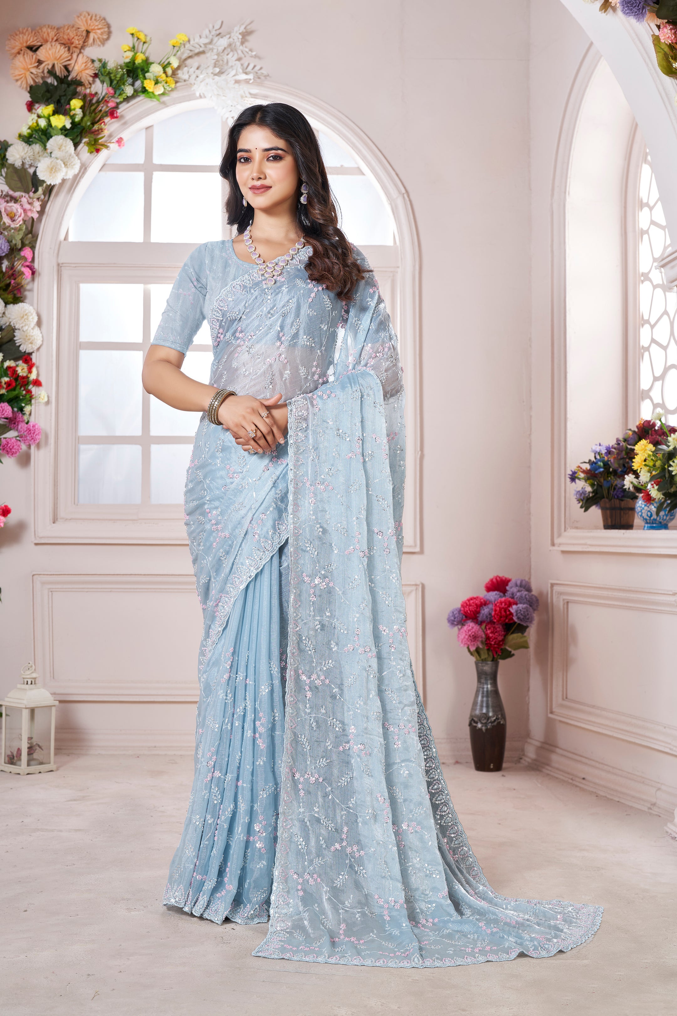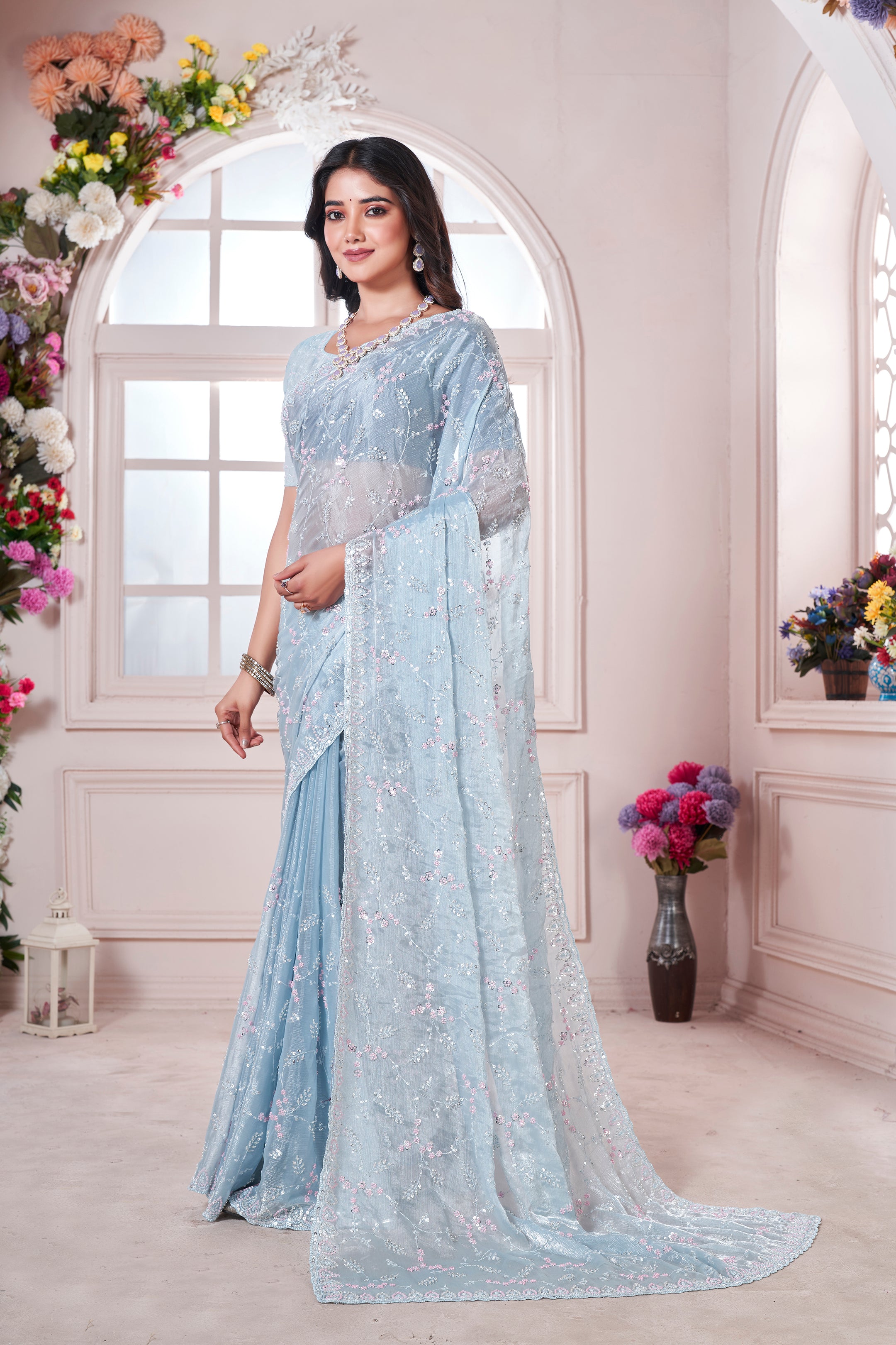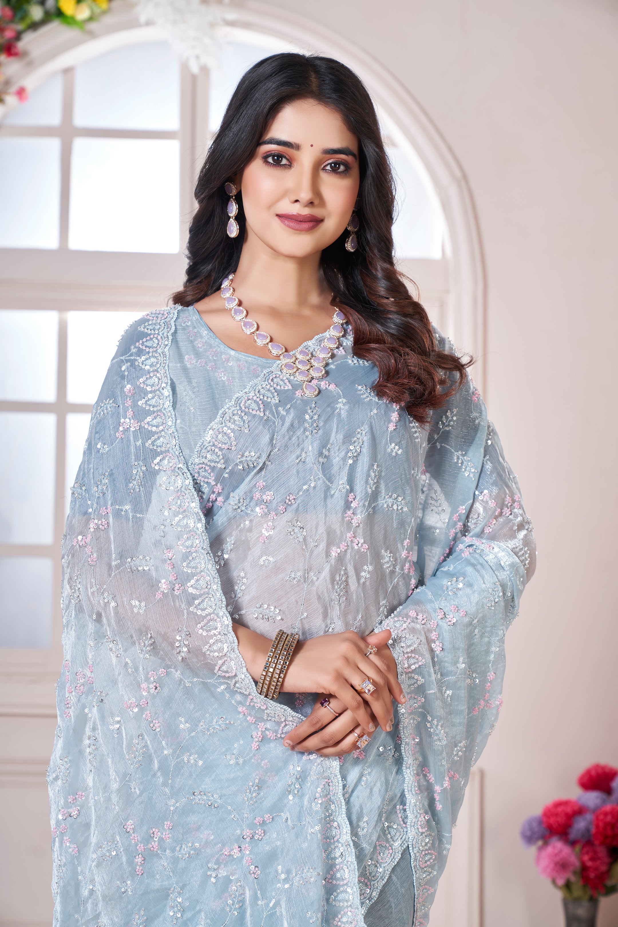 Sky Blue Zari Chiffon Saree with Ethereal Sheen & Flowing Drape