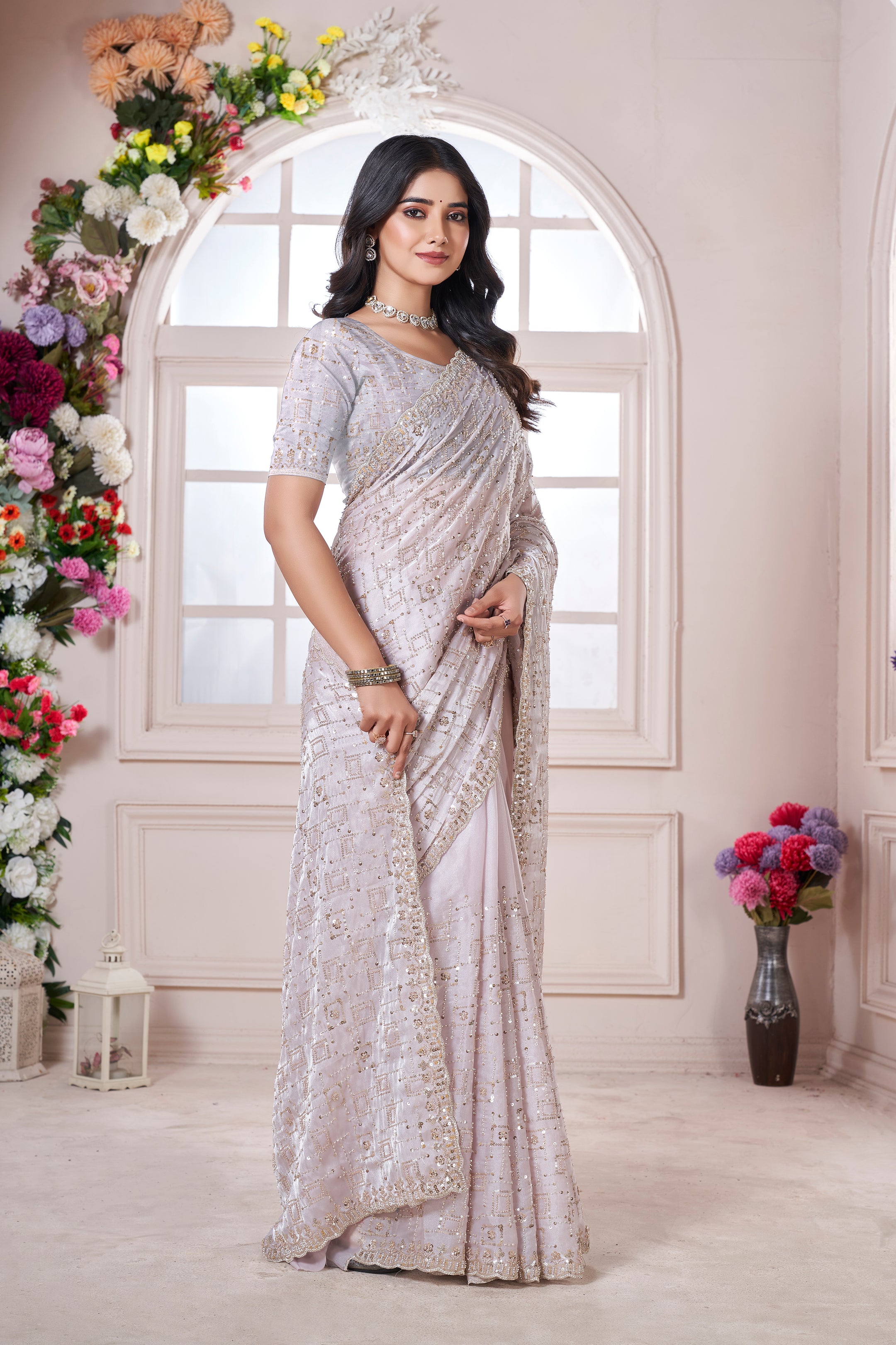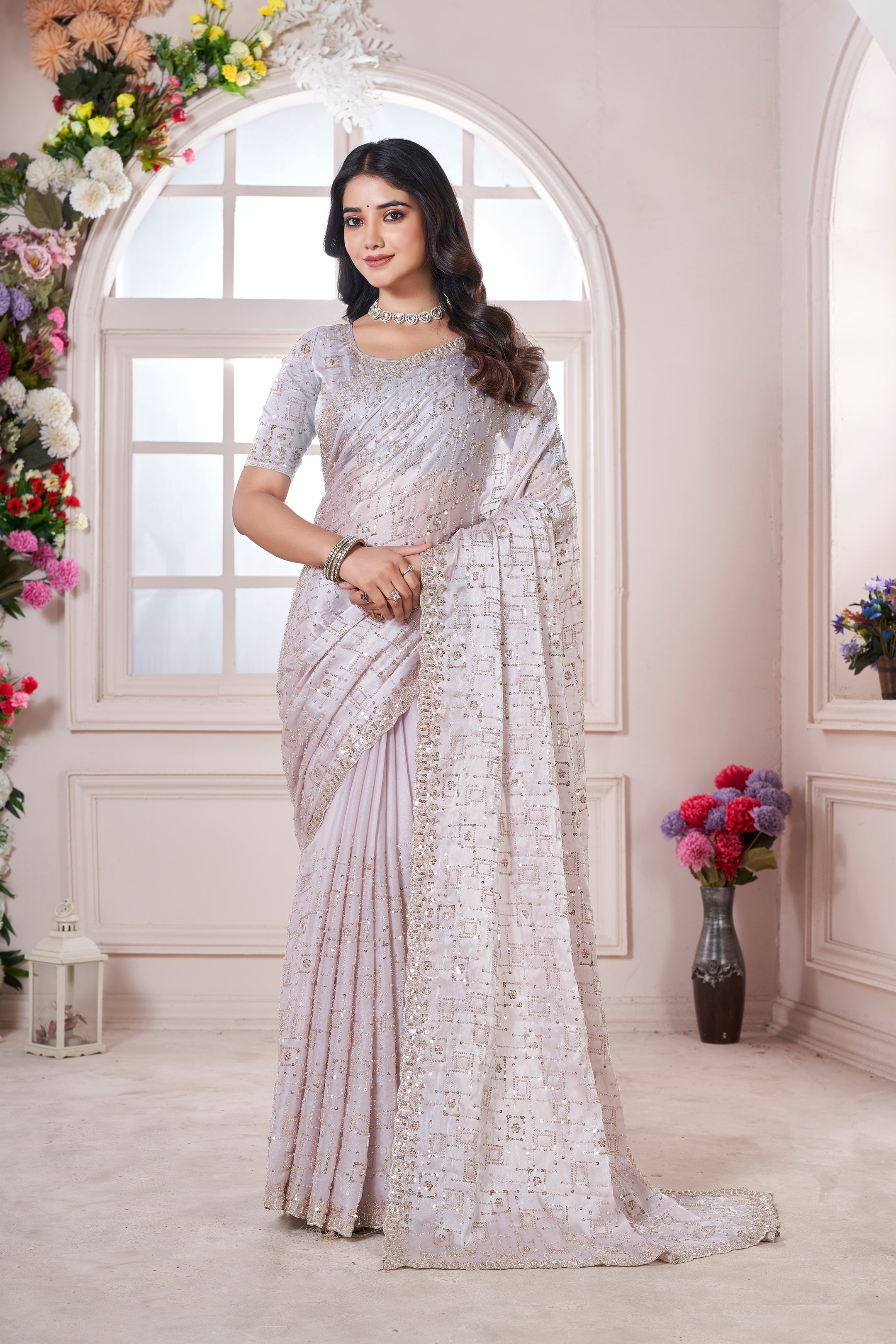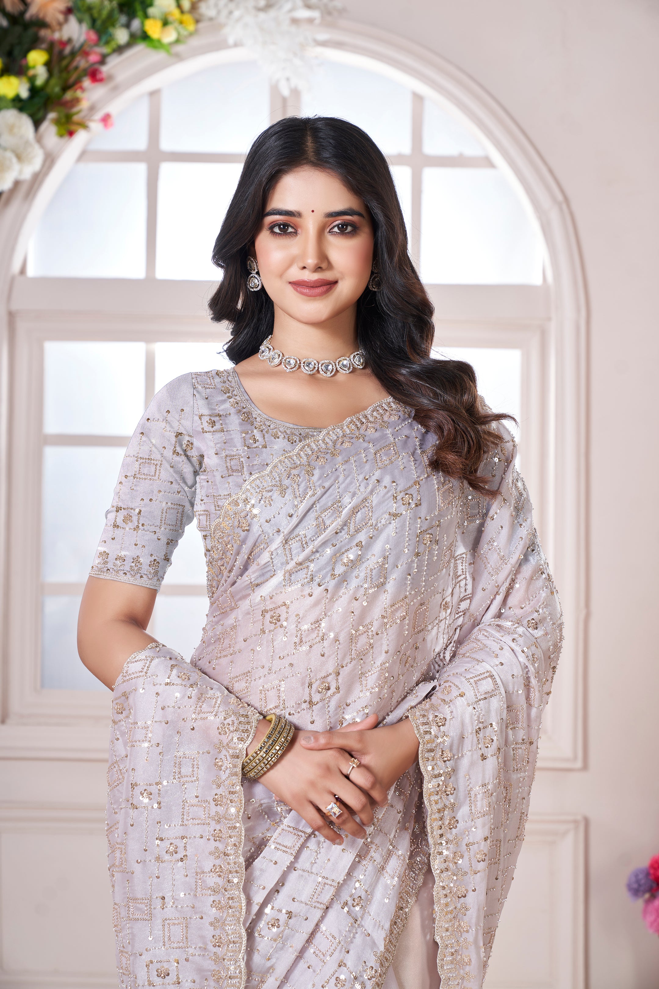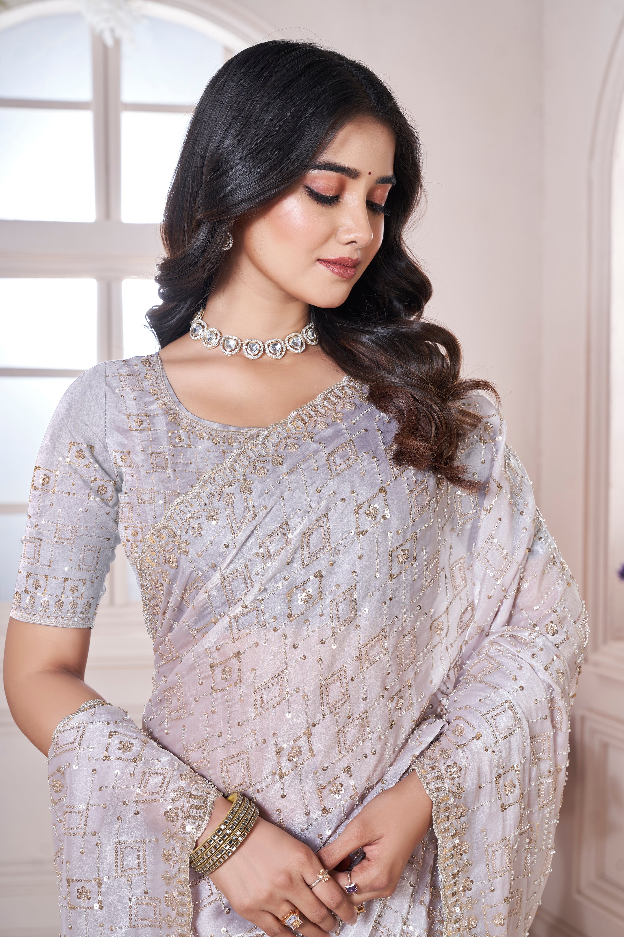 Get ready to turn heads with this Grey Chiffon Saree embellished with Golden Beads & Sequins! The luxurious chiffon fabric and intricate detailing create a mesmerizing effect, perfect for weddings, festive occasions, and elegant evenings. Its graceful drape adds an effortless charm to your every move. Elevate your style with this stunning blend of elegance and glamour.